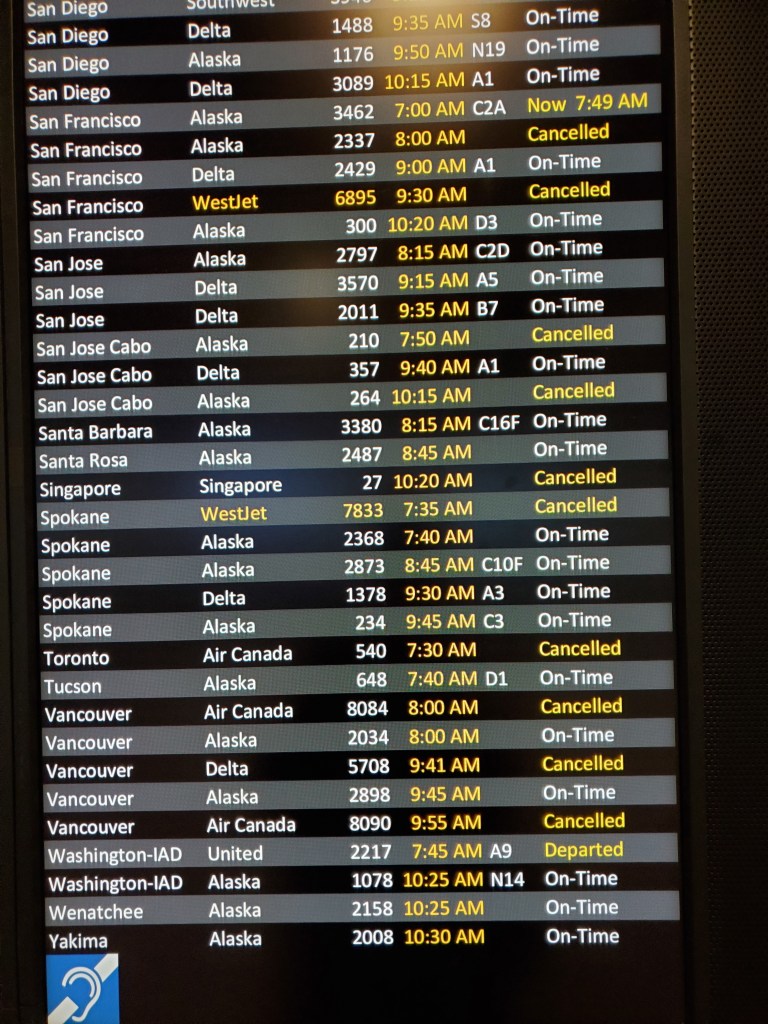After a brief and somewhat un-restful sleep last night, it was off to the airport, which was decidedly not operating as normal. Not many people are traveling, about 80% of people are wearing masks in the airport, all the shops are closed save for Starbucks, newsstands, and some other cafes. I’d say about 1/4 of the flights in Seattle-Tacoma have been canceled. On the bright side, everything is clean and more orderly, well, since Covid requires that we do so.